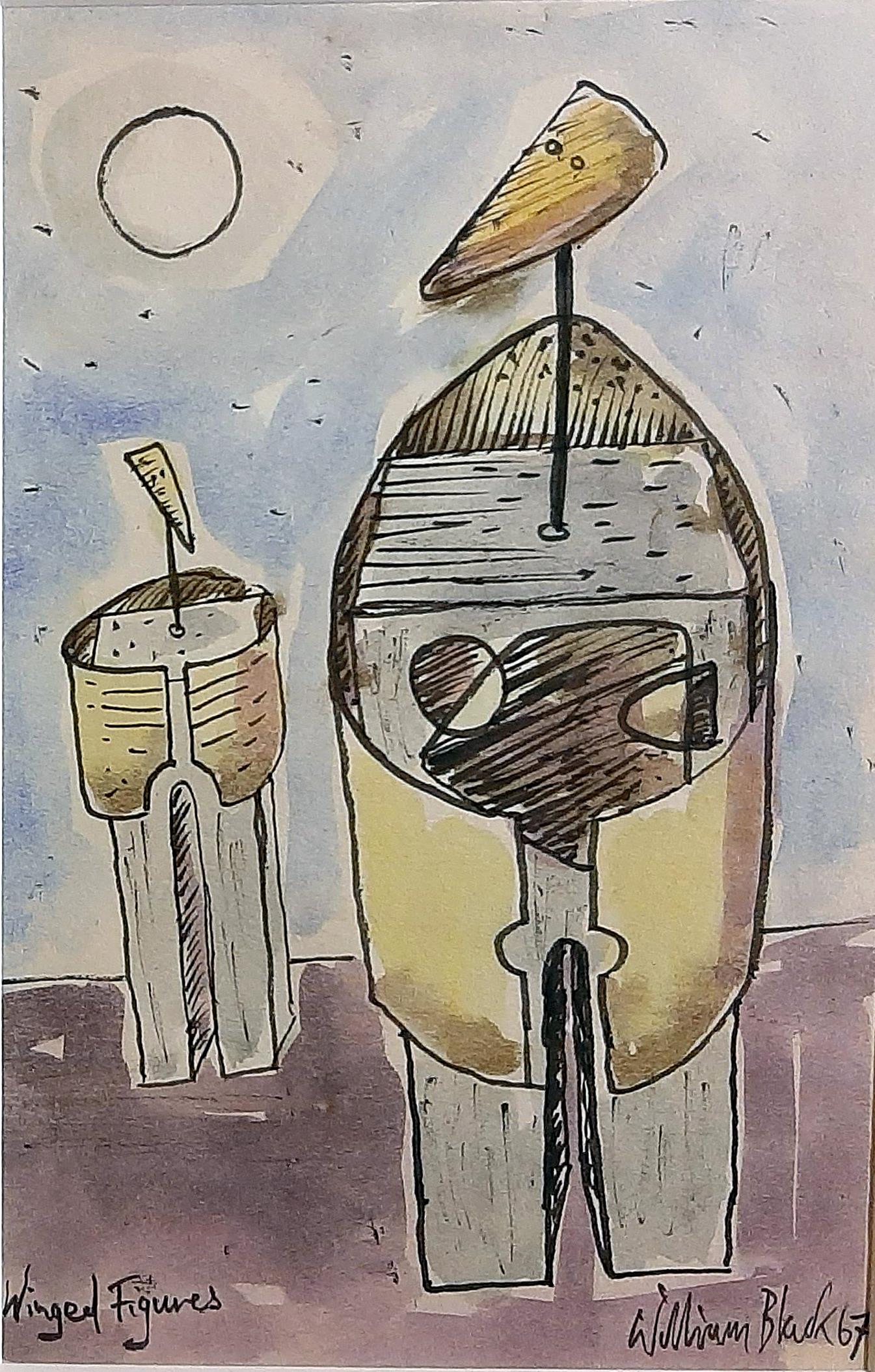 In this watercolour William black returns to one of his favourite subjects of angels. Depicting 2 angels with folded wings over their bodies in a deserted background with a sun shining in the back. It is very likely that this image would have been made as a study for a pair of sculptures.